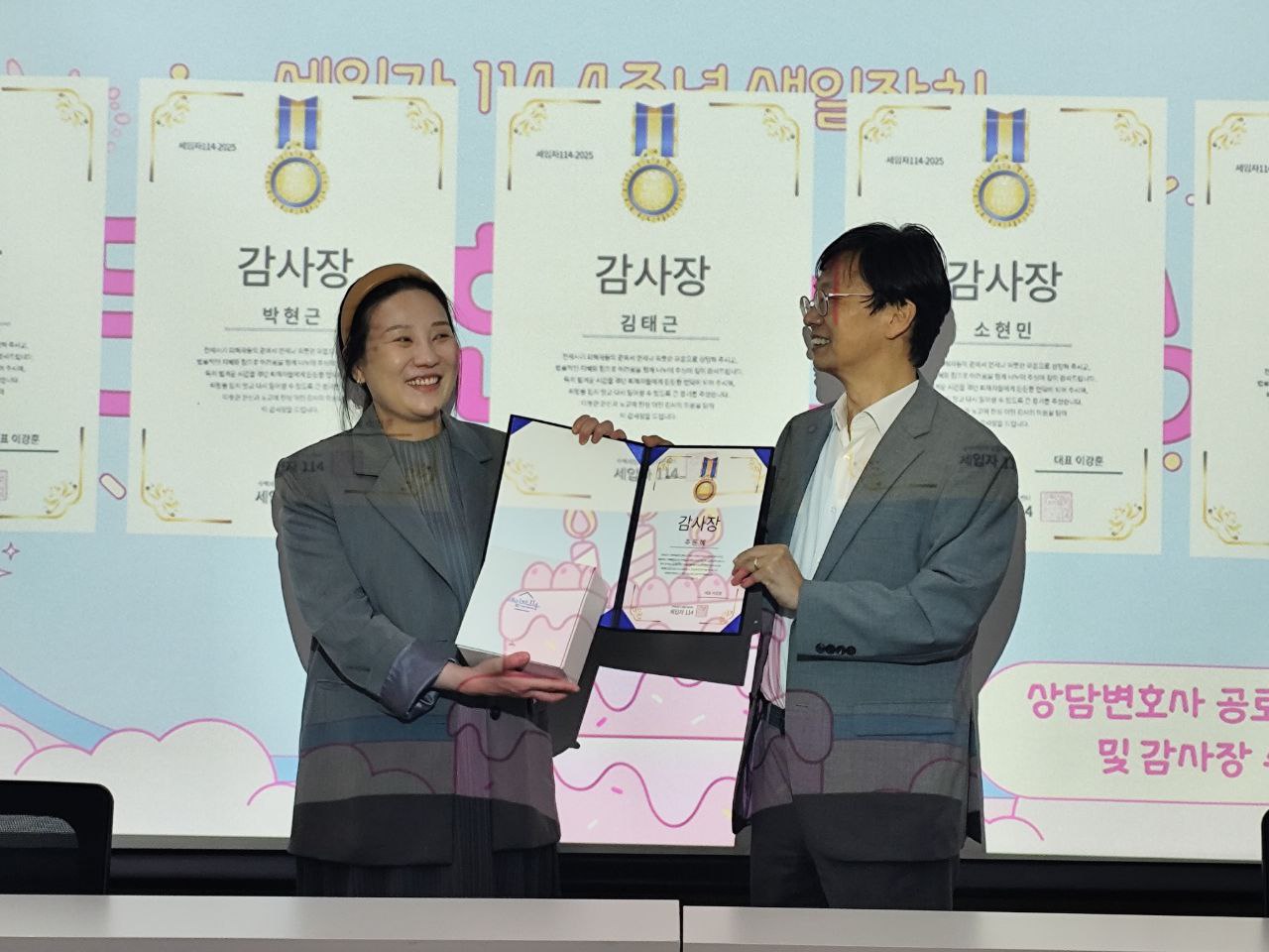 특히 ‘세입자들의 든든한 언덕상’은 운영위원을 제외하고 가장 많은 상담에 참여한 류재상 변호사님께 돌아갔습니다. 무려 100건에 가까운 상담을 자원활동으로 진행해오신 류 변호사님께는 ‘세입자들의 든든한 언덕, 류재상 변호사님’이라는 문구가 새겨진 펜과 세입자114 로고가 담긴 머그컵이 전달되었습니다. 수상 소감을 전한 류 변호사님은 “세입자들의 든든한 언덕이라는 이름만으로도 벅찬 감동을 느꼈다”며 울컥한 마음을 드러냈습니다.