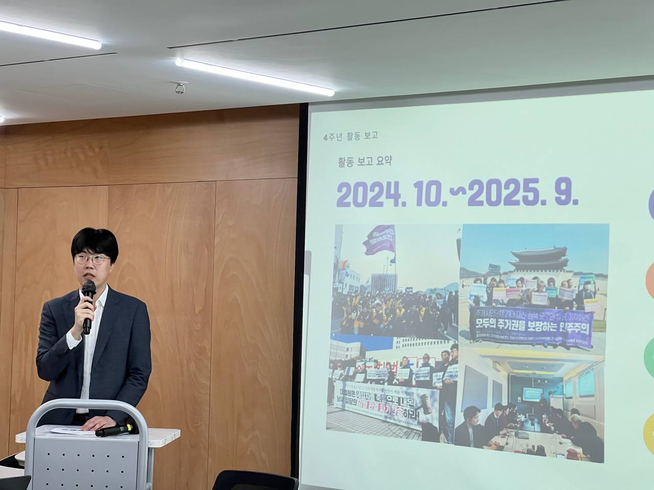 이강훈 센터장의 환영사에 이어 전국 전세사기 대책위원회 위원장과 국회의원들의 영상 축하 메시지가 이어졌으며, 현장에 함께한 회원과 위원장·변호사·활동가들의 축하 인사로 자리가 더욱 빛났습니다. 그 다음 순서로는, 소현민 사무처장의 활동보고를 통해 지난 1년간 세입자114가 걸어온 다양한 활동을 함께 돌아보는 시간을 가졌습니다.