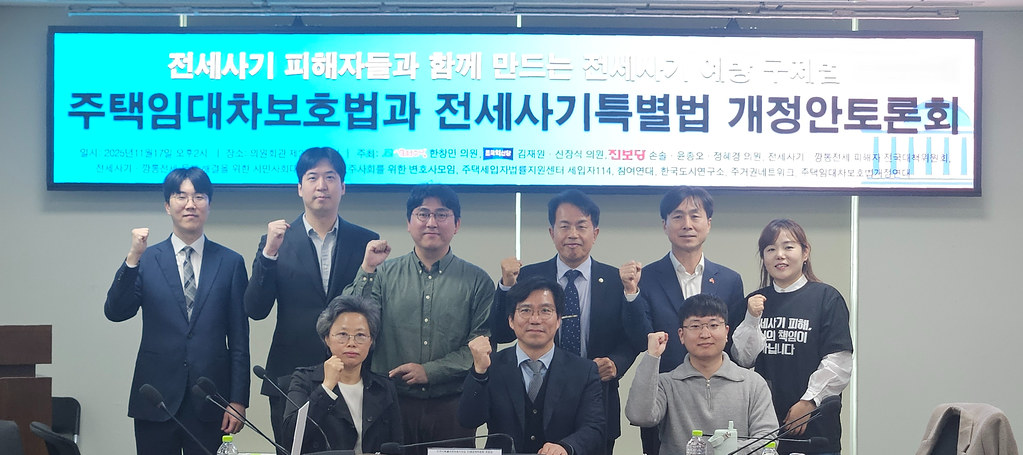 11월 17일 국회에서 열린 ‘전세사기 예방·구제법’ 토론회에서 피해자와 전문가들은 전세사기를 “주거권과 생존권을 위협하는 사회적 재난”으로 규정하며 제도 개선을 촉구했습니다. 소현민 세입자 114 사무처장은 임차인의 대항력이 다음 날이 아닌 “그날 0시부터” 발생하도록 법을 개정해야 ‘동시진행형 사기’를 막을 수 있다고 강조했습니다. 토론자들은 임대차3법 보완 유지, 세입자 권리 강화, 전세 위험성 점검 체계 구축 등을 주요 개선 과제로 제시했습니다.