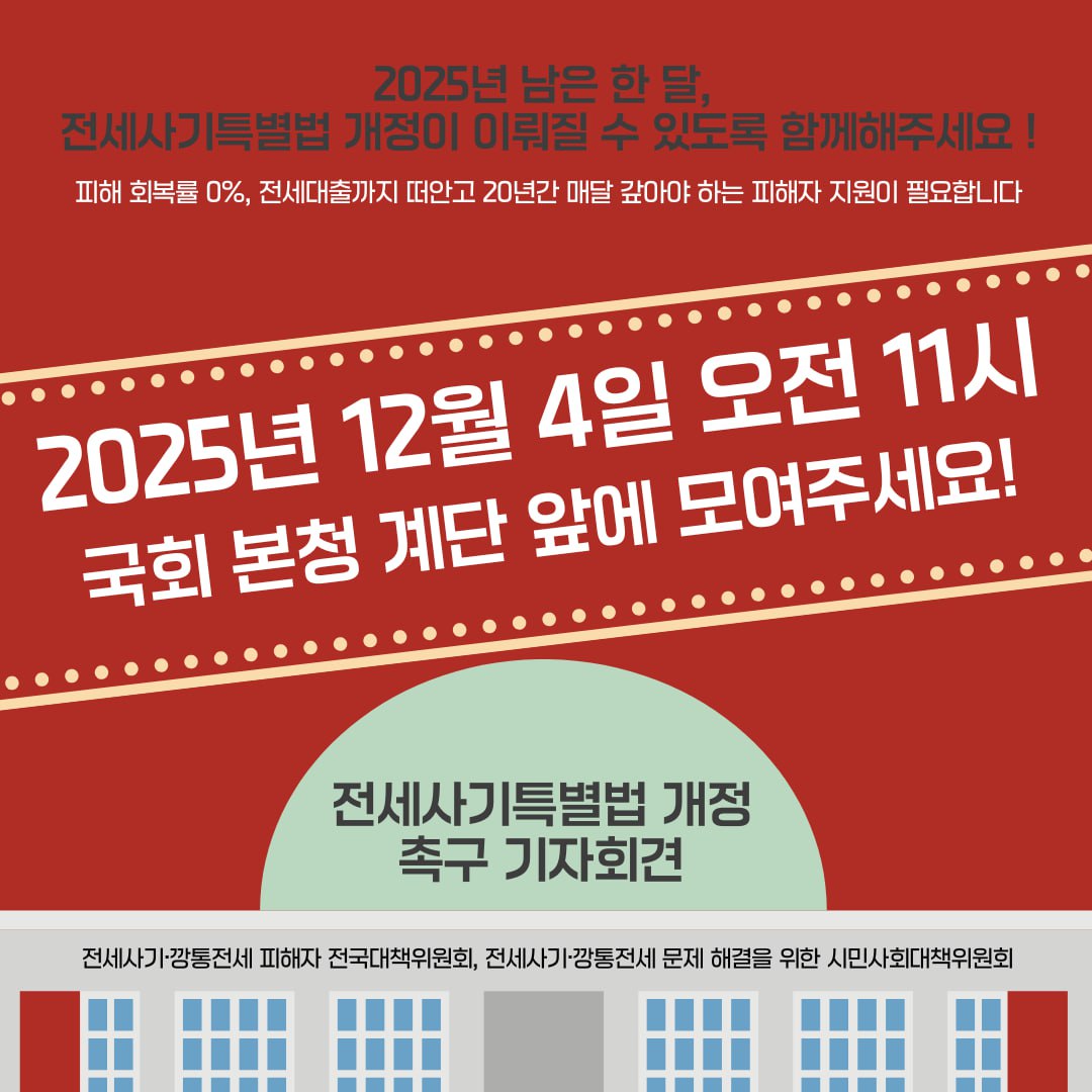 전세사기 피해자와 시민단체들은 12월 4일 오전 11시, 국회에서 전세사기특별법 연내 개정을 촉구하는 기자회견을 진행할 예정입니다. 많은 관심과 참여를 부탁드립니다