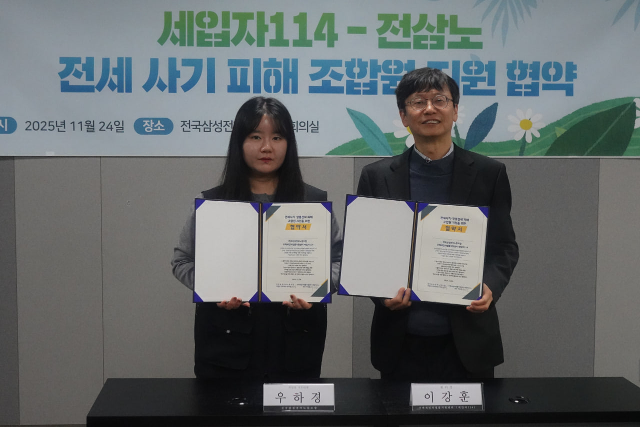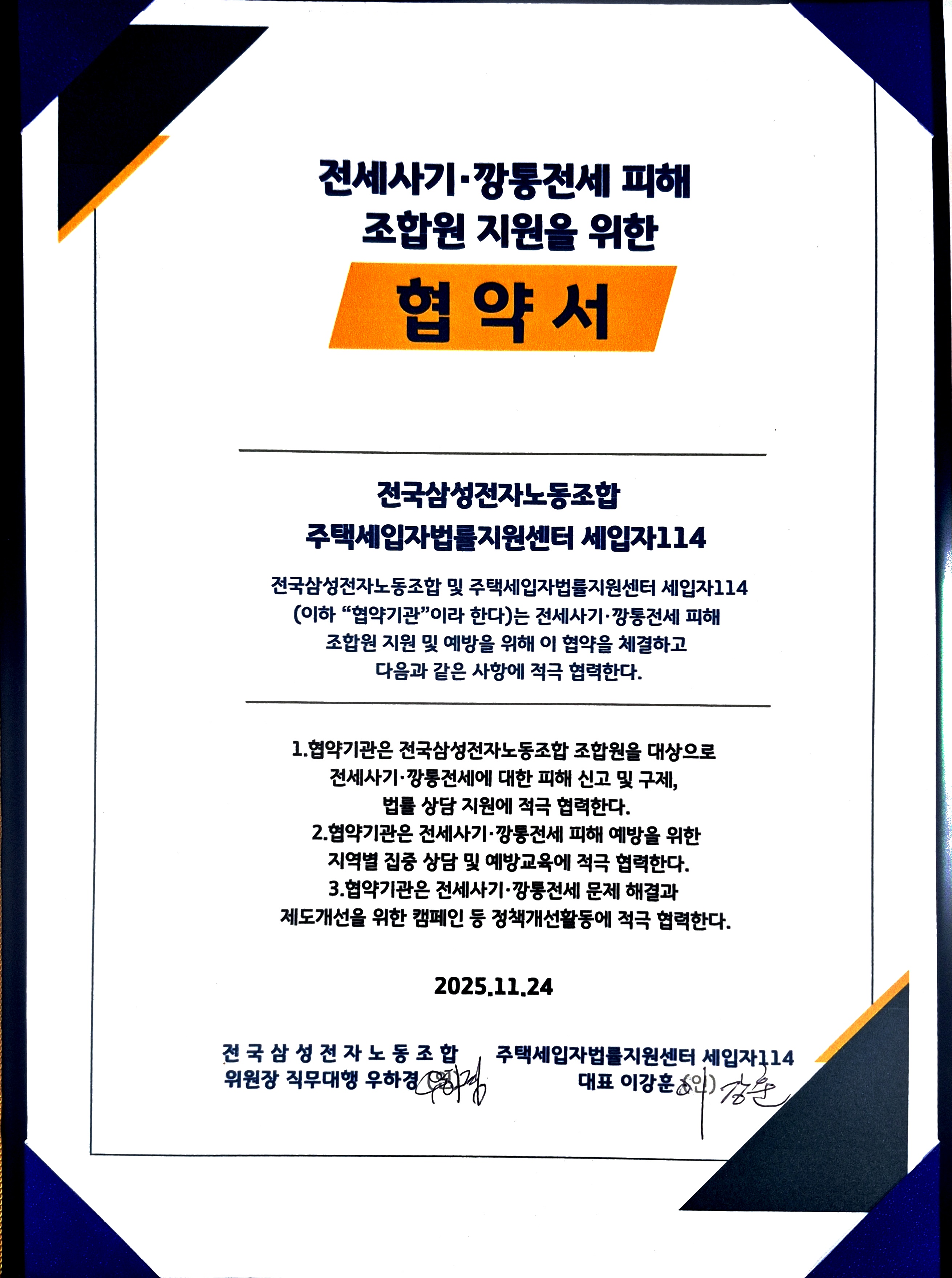 세입자114와 전삼노(전국삼성노동조합)는 11월 24일 전세사기 피해 조합원 지원을 위한 협약을 체결했습니다. 양 기관은 조합원 대상 법률 상담, 예방 교육, 집중 상담, 제도개선 캠페인을 함께 추진하기로 했습니다. 이강훈 세입자114 센터장은 "전세사기 피해는 예방이 가장 중요하며, 이미 피해를 입은 분들에게는 전문적인 법률 지원이 절실하다."며, "전삼노 조합원들의 안정적인 거주를 위해 세입자114의 전문성과 경험으로 최선을 다해 지원하겠다."고 밝혔습니다. 우하경 전삼노 위원장 직무대행은 "화성, 수원, 평택 등 조합원 거주지역에 전세사기 피해가 많이 발생했다는 소식을 접하고 우리 조합원 중에도 피해자가 있을 것으로 판단했다."며, "전세사기 피해에 대한 법률 지원은 물론, 부동산 전반에 대한 예방 교육으로 활동 범위를 확대해 나갈 계획"이라고 밝혔습니다.