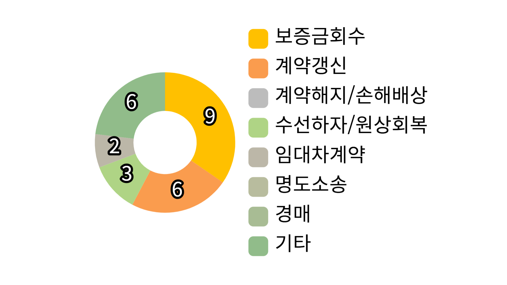 11월 상담은 총 26건 이루어졌습니다. 11월에도 전세사기 관련 상담이 여러 건 있었습니다. 전세사기의 문제가 계속 발생하고 있습니다. 전세사기 예방 및 피해자 지원을 위한 관련 법이나 제도가 더욱 더 강화되어야 합니다. 앞으로 세입자114는 세입자들을 위한 법률 상담이외에도 관련한 제도와 법을 개선하기 위해 다양한 노력을 펼치도록 하겠습니다!